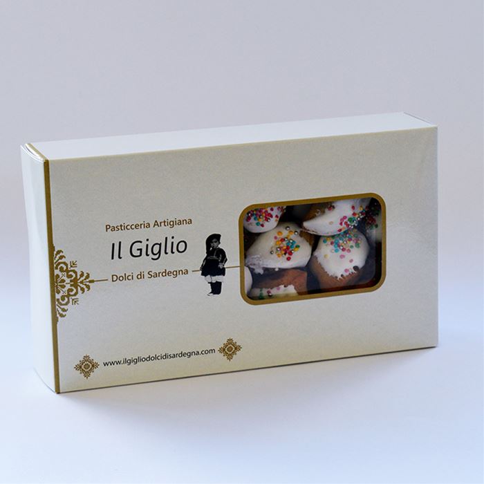 Consegna a € 14,99Biscotti artigianali della tradizione Sarda con mandorle, uvetta e glassa di zucchero - Confezione rigida riciclabile 350 g