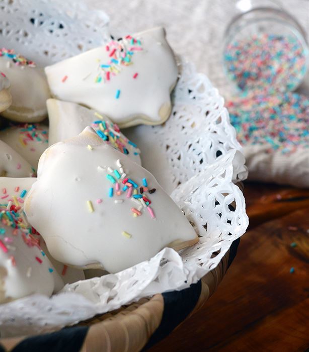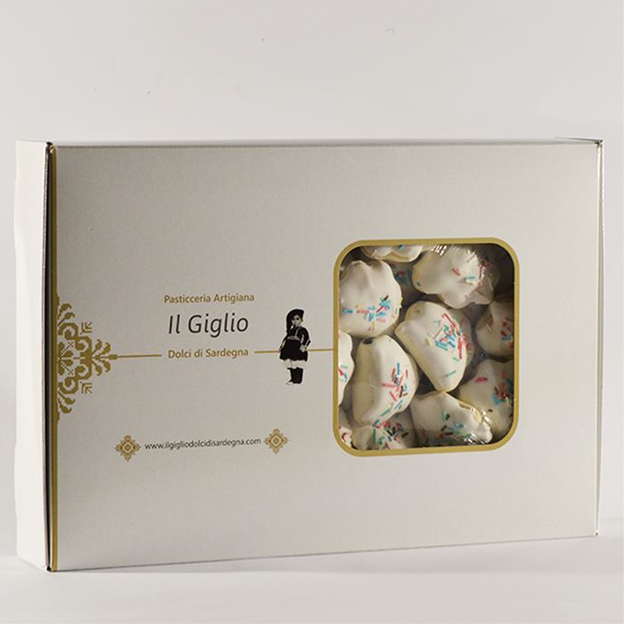 Biscotto ripieno di sapa di uve rosse realizzato con due sottili sfoglie di pasta che si chiudono a scrigno avvolgendo una densa crema di sapa (mosto cotto), adornate con una leggera glassatura e colorate praline di zucchero. Dolci sardi artigianali frutto della pazienza di mani esperte, che hanno affinato manualità e tecnica durante gli anni, e dell'unione di ingredienti di prima scelta che restituiscono, a chi assapora i nostri dolci, quei profumi e sapori ancestrali, di un sapere custodito dalla cultura gastronomica e dalle tradizioni locali.