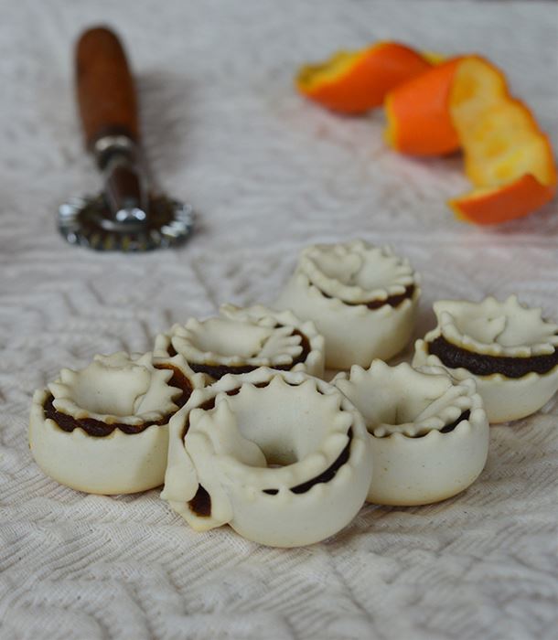 Biscotto ripieno di sapa di uve rosse realizzato interamente a mano con una sottile sfoglia di semola che si chiude ad anello su una densa crema di sapa (mosto cotto). Dolci sardi artigianali frutto della pazienza di mani esperte, che hanno affinato manualità e tecnica durante gli anni, e dell'unione di ingredienti di prima scelta che restituiscono, a chi assapora i nostri dolci, quei profumi e sapori ancestrali, di un sapere custodito dalla cultura gastronomica e dalle tradizioni locali.
