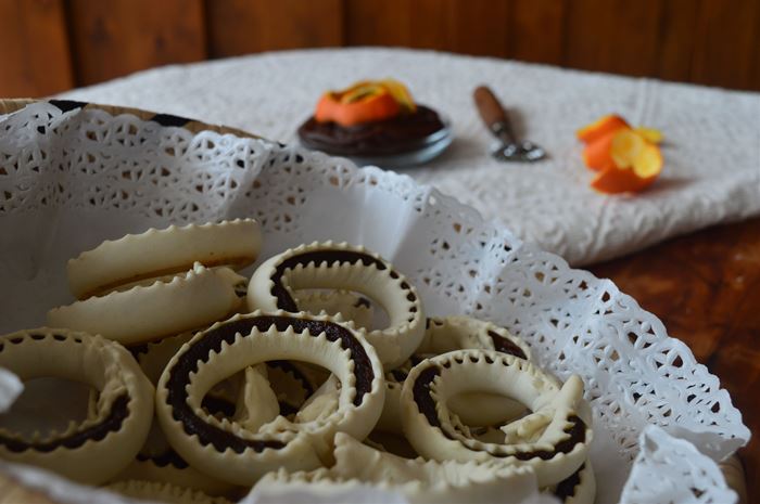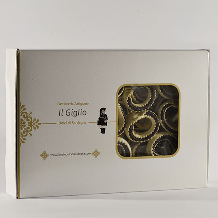 Biscotto ripieno di sapa di uve rosse realizzato interamente a mano con una sottile sfoglia di semola che si chiude ad anello su una densa crema di sapa (mosto cotto). Dolci sardi artigianali frutto della pazienza di mani esperte, che hanno affinato manualità e tecnica durante gli anni, e dell'unione di ingredienti di prima scelta che restituiscono, a chi assapora i nostri dolci, quei profumi e sapori ancestrali, di un sapere custodito dalla cultura gastronomica e dalle tradizioni locali.