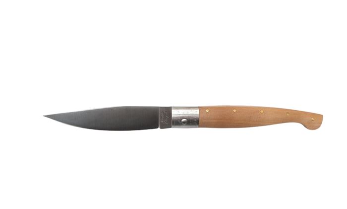 Manico con guancette in legno di ginepro, collarino in acciaio 316, archetto e lama in acciaio 1.4116 ad uso alimentare
