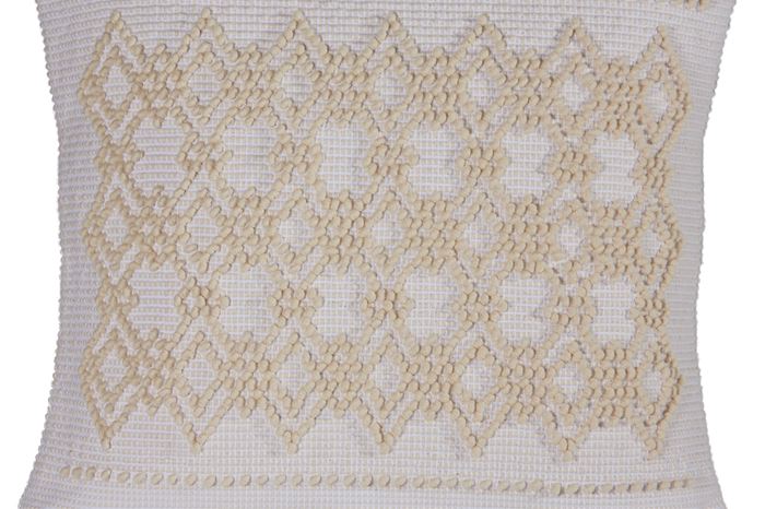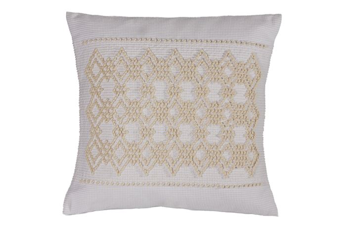 Cuscino Alberghetto lavorato a mano con tecnica pibiones. Design geometrico della tradizione tessile.