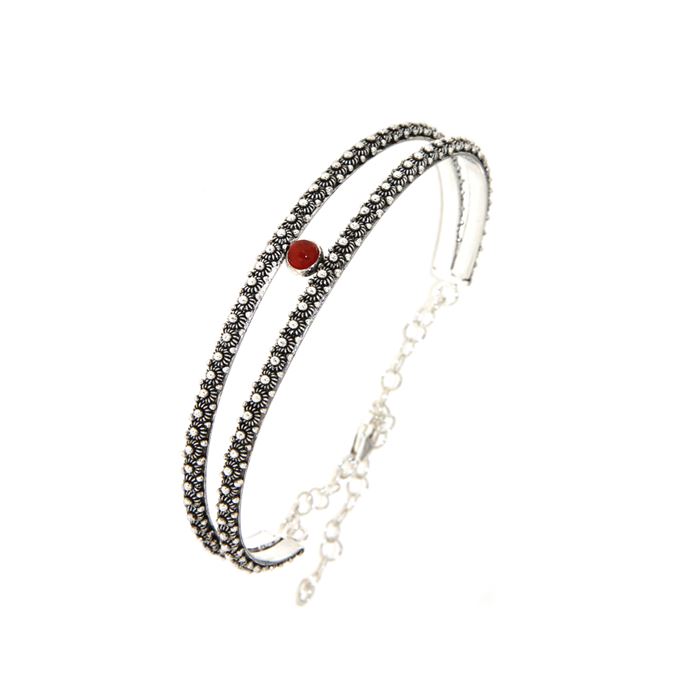 Consegna GRATISBracciale rigido in argento 925/1000 decorato con due file di roselline in nido d'ape al cui interno è racchiuso il castone con un'agata corniola, il bracciale è chiuso da una catena con moschettone.