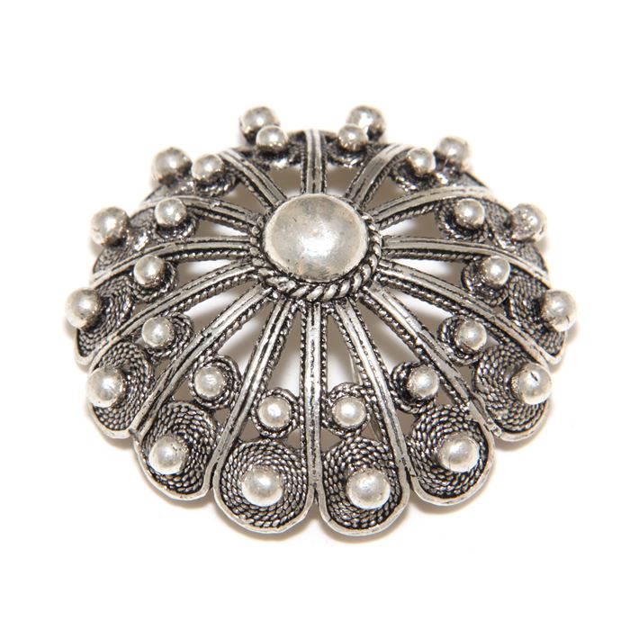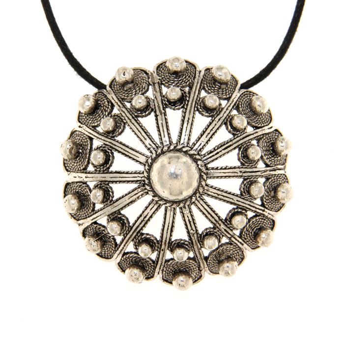 Consegna GRATISCiondolo mezzo bottone sardo in argento 925/1000, realizzato artigianalmente con la tecnica della filigrana e della fusione a cera persa, rifinito e assemblato a mano. Il cordoncino in cotone cerato nero, regolabile in lunghezza, è compreso nel prezzo.