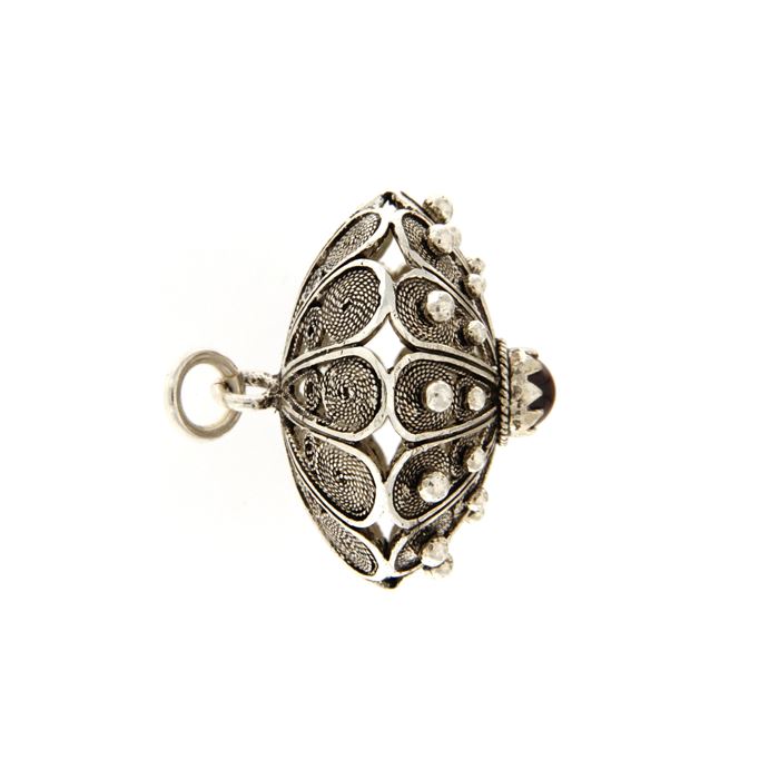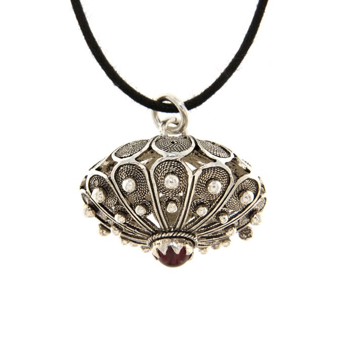 Consegna GRATISBottone sardo in argento 925/1000 con un granato taglio cabochon. Il ciondolo è realizzato artigianalmente con la tecnica della fusione a cera persa e della filigrana, rifinito e assemblato a mano. Il cordoncino in cotone cerato, regolabile in lunghezza, è compreso nel prezzo.