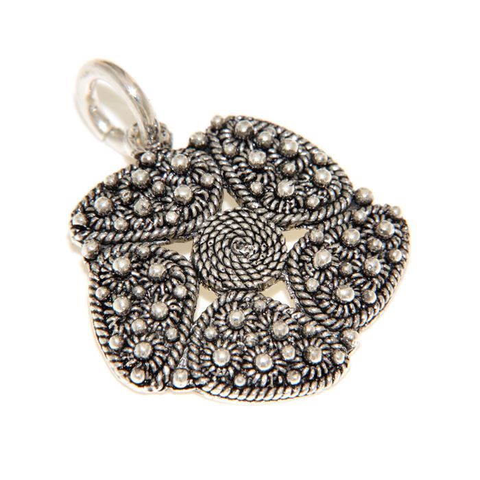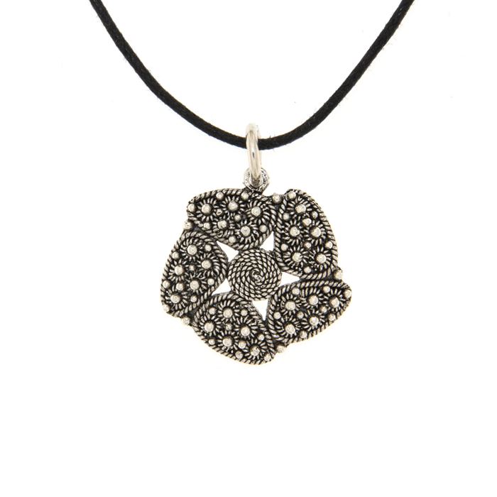 Consegna a € 9,99Ciondolo in argento 925/1000 brunito a forma di fiore, la corolla è realizzata in spirali di filigrana sarda mentre i petali sono decorati con la tecnica della filigrana a nido d'ape. Il ciondolo è realizzato artigianalmente con le tecniche della filigrana sarda a spirale, nido d'ape e fusione a cera persa, rifinito e assemblato a mano. Il cordoncino in cotone cerato nero, regolabile in lunghezza, è compreso nel prezzo.