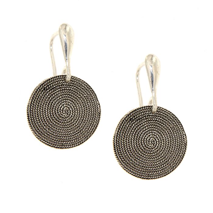 Consegna a € 9,99Orecchini pendenti in argento brunito 925/1000, con gancio lucido a goccia ed elementi realizzati artigianalmente con le tecniche della filigrana a spirale e della fusione a cera persa, rifiniti e assemblati a mano.