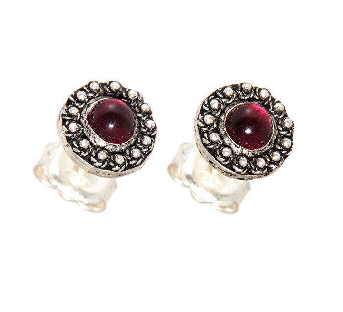 Consegna a € 9,99Orecchini a lobo in argento 925/1000 brunito con granati taglio cabochon inseriti in una cornice decorata in filigrana sarda. Gli orecchini sono realizzati artigianalmente con le tecniche della filigrana sarda, granulazione e della fusione a cera persa, rifiniti e assemblati a mano.