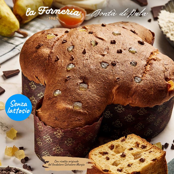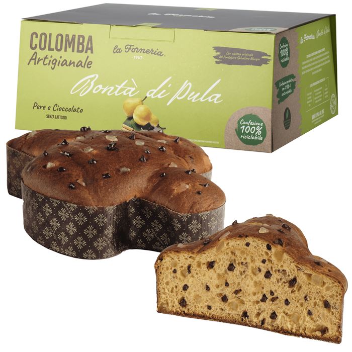 Colomba artigianale con pere, gocce di finissimo cioccolato fondente e cannella.
