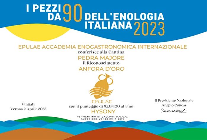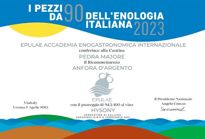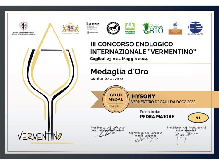 NOTE DELL'ENOLOGO: Hysony è prodotto da uve Vermentino D.o.c.g. di Gallura, maturate nell'alta collina della Gallura meridionale. Per produrre questo vino è stata fatta una attenta selezione delle uve del vigneto, controllando accuratamente tutte le caratteristiche degli acini, delle bucce e del succo, allo scopo di ottenere un vino strutturato pieno di corpo e fruttato.