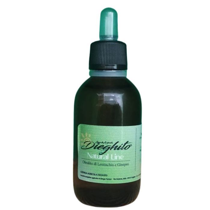 Ingredienti: Olio di Lentischio, drupe di lentischio, bacche di ginepro, olio extra vergine di oliva, olio essenziale di ginepro