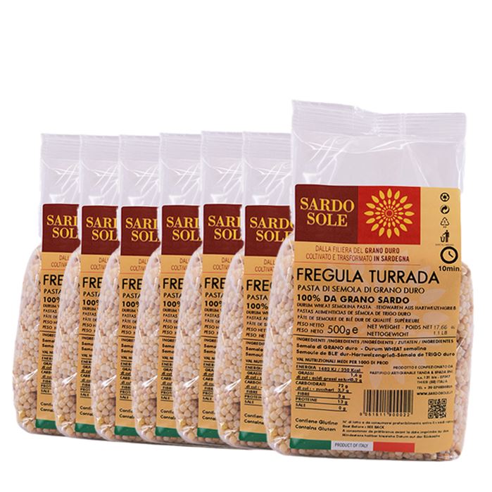 La fregula turrada Sardo Sole è una pasta di semola di grano duro, ottenuta dalla lavorazione esclusivamente di cereali sardi al 100%, provenienti dalle aree di produzione della Marmilla e del Sinis Ottima con condimenti di pesce , carne e verdure