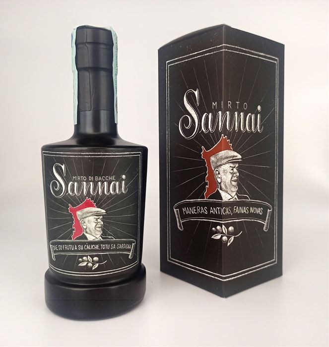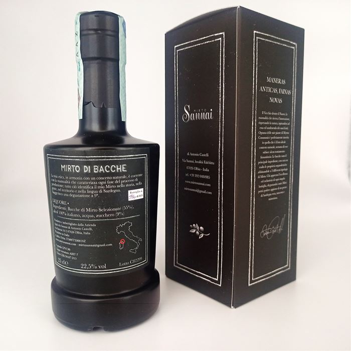 Liquore identitario ottenuto dall' infusione di sole Bacche di Mirto, varietà Maria Antonietta, in alcol da grano tenero 100% italiano. Presenta un colore rosso rubino e un impatto olfattivo che si apre con accenni salmastri, su una trama di bacche compatta, scura e dolce, seguita da note balsamiche di macchia mediterranea.