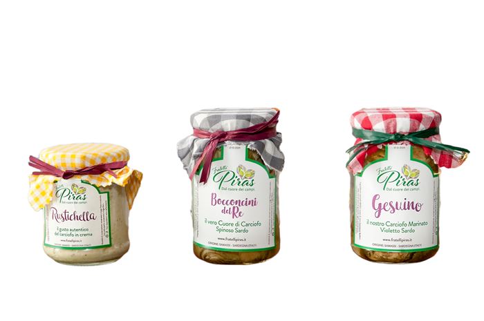 I F.lli Piras propongono in confezione regalo il tris di carciofini sott´olio, che contiene i carciofini marinati (carciofo spinoso e violetto sardi):