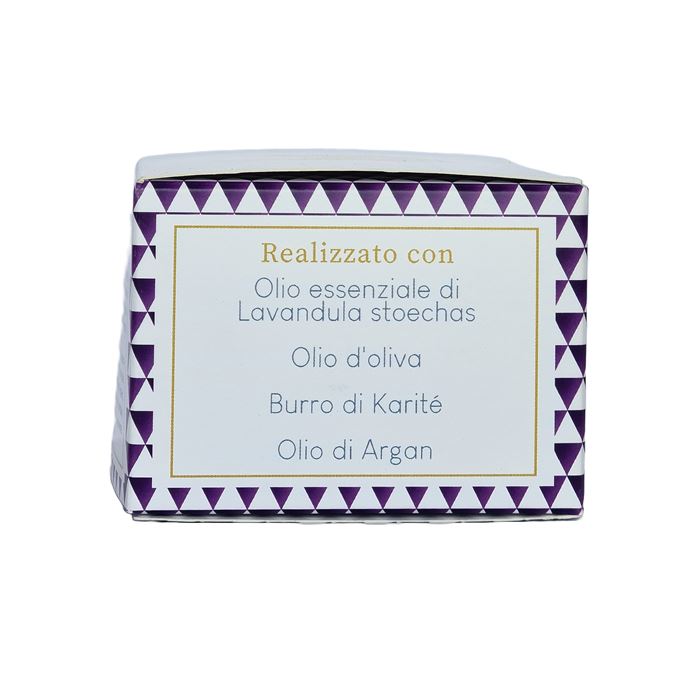 A base di Burro di Karité, olio d´oliva, olio d´Argan e olio essenziale di Lavandula Stoechas.