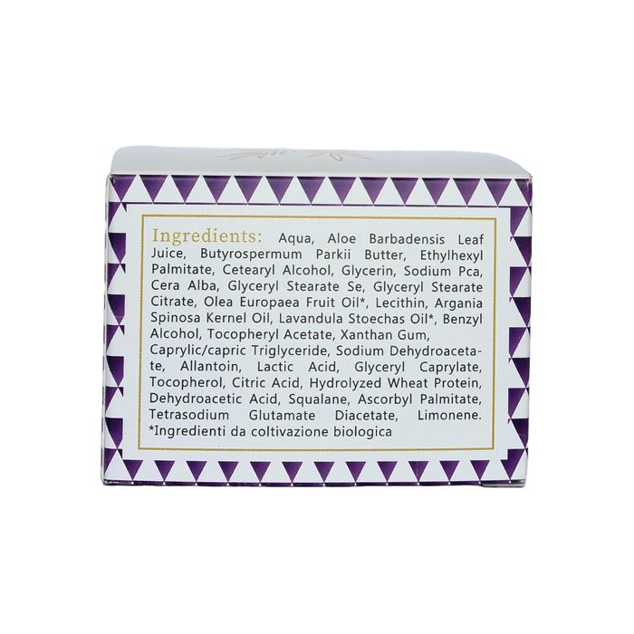 Inci Aqua, Aloe Barbadensis Leaf juice, Butyrospermum Parkii butter, Ethylhexyl Palmitate, Cetearyl Alcohol, Glyceryn, Sodium Pca, Cera Alba, Glyceryl Stearate Se, Glyceryl Stearate Citrate, Olea Europaea fruit oil*, Lecithin, Argania Spinosa Kernel Oil, Lavandula Stoechas Oil*, Benzyl Alchol, Tocopheryl Acetate, Xanthan Gum, Caprylic/capric Triglyceride, Sodium Dehydroacetate, Allantoin, Lactic Acid, Glyceryl Caprylate, Tocopherol, Citric Acid, Hydrolyzed Wheat Protein, Dehydroacetic Acid, Squalane, Ascorbyl Palmitate, Tetrasodium Glutamate Diacetate, Limonene.*Ingredienti da Coltivazione Biologica