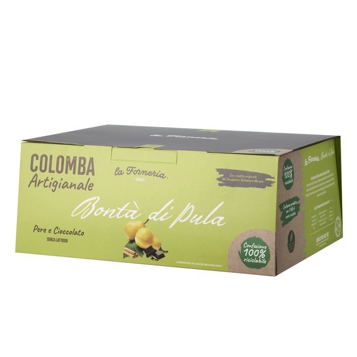 La nostra colomba artigianale pere, gocce di cioccolato fondente e cannella si caratterizza per un impasto soffice e morbido di un colore giallo paglierino ed un profumo di pere williams, cannella, cioccolato fondente, uova, burro, vaniglia e zucchero.